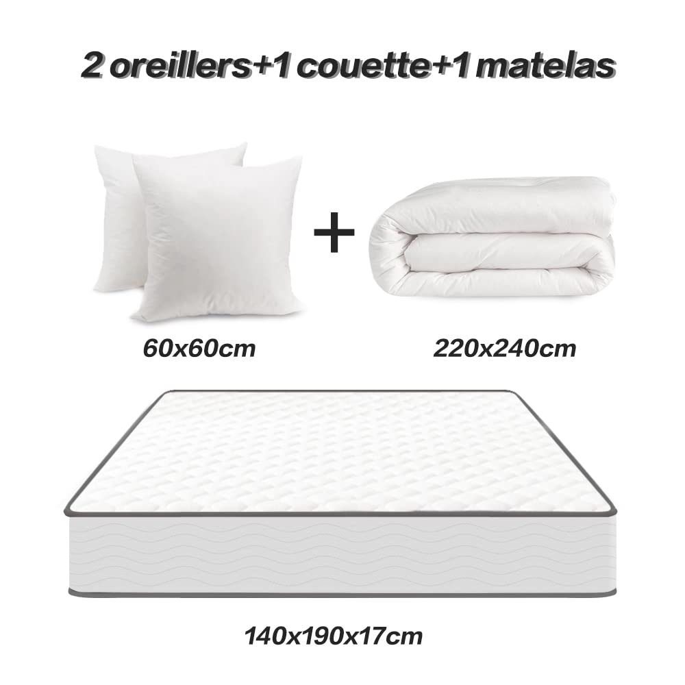 - [Ensemble Matelas et Couette et Oreiller] Cet article contient un matelas 140x190x17cm et une couette 200x240cm et deux oreillers 60x60cm.